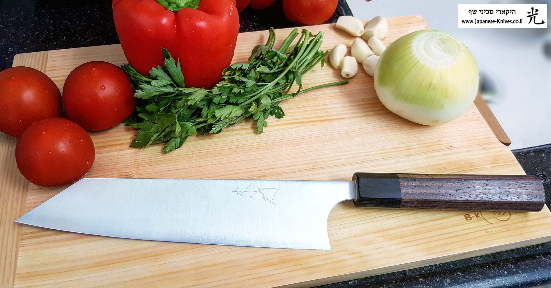 1. קוצצים לתוך קערה גדולה את ה: עגבניות (חוץ מאחת), בצל, פטרוזיליה (בתמונה סכין שף מבית שיבאטה).