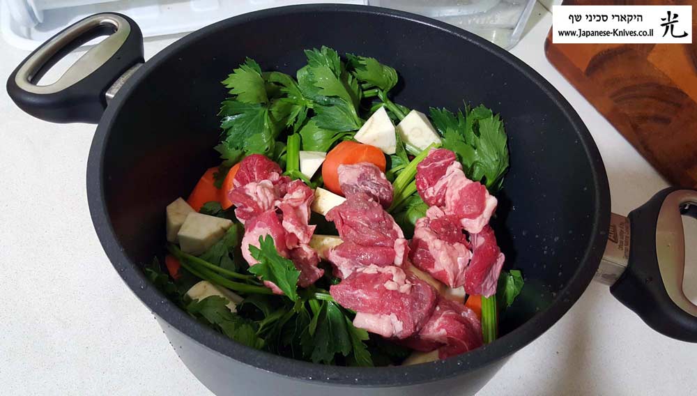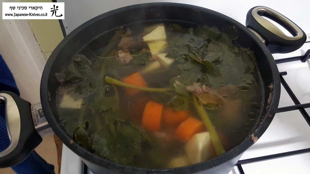 - מרתיחים כשעה בסיר עם 3-4 ליטר מים יחד עם הבשר והעלים של הסלרי והפטרוזיליה ומלח/פלפל לפי טעם. לאחר מכן יש להוציא את הכל ולשמור רק את הציר (המים).