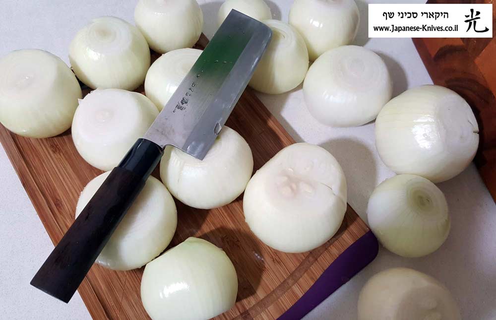 - יש לחתוך את כל הבצלים לרבעים ואז לפרוס אותם לפרוסות בעובי בינוני (מומלץ בעזרת סכין ירקות מסוג נקירי).